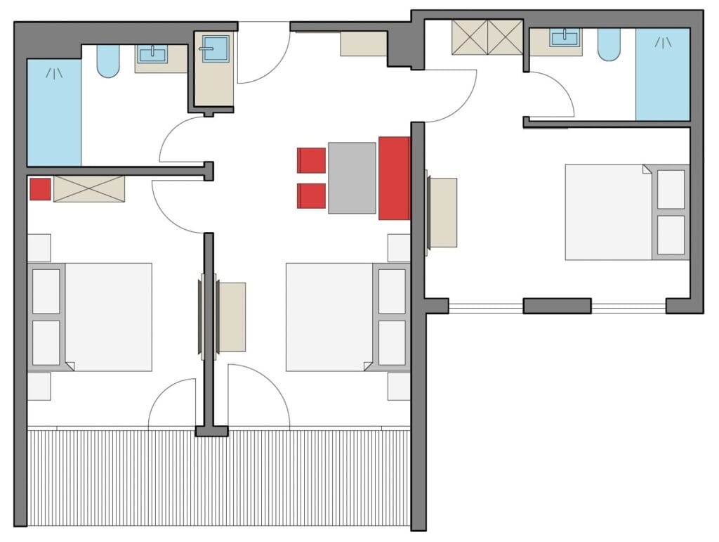 Verbringen Sie Ihren Familienurlaub in unseren frisch renovierten neuen Junior Suiten Deluxe Premium. Unsere neuen Zimmer sind wirklich etwas Besonderes! Sie sind perfekt für große Familien geeignet. Sie verfügen über zwei separate Schlafzimmer mit jeweils einem eigenem Bad. Im Wohnbereich gibt es ein weiteres Doppelbett und die Möglichkeit sich gemütlich zusammenzusetzen.